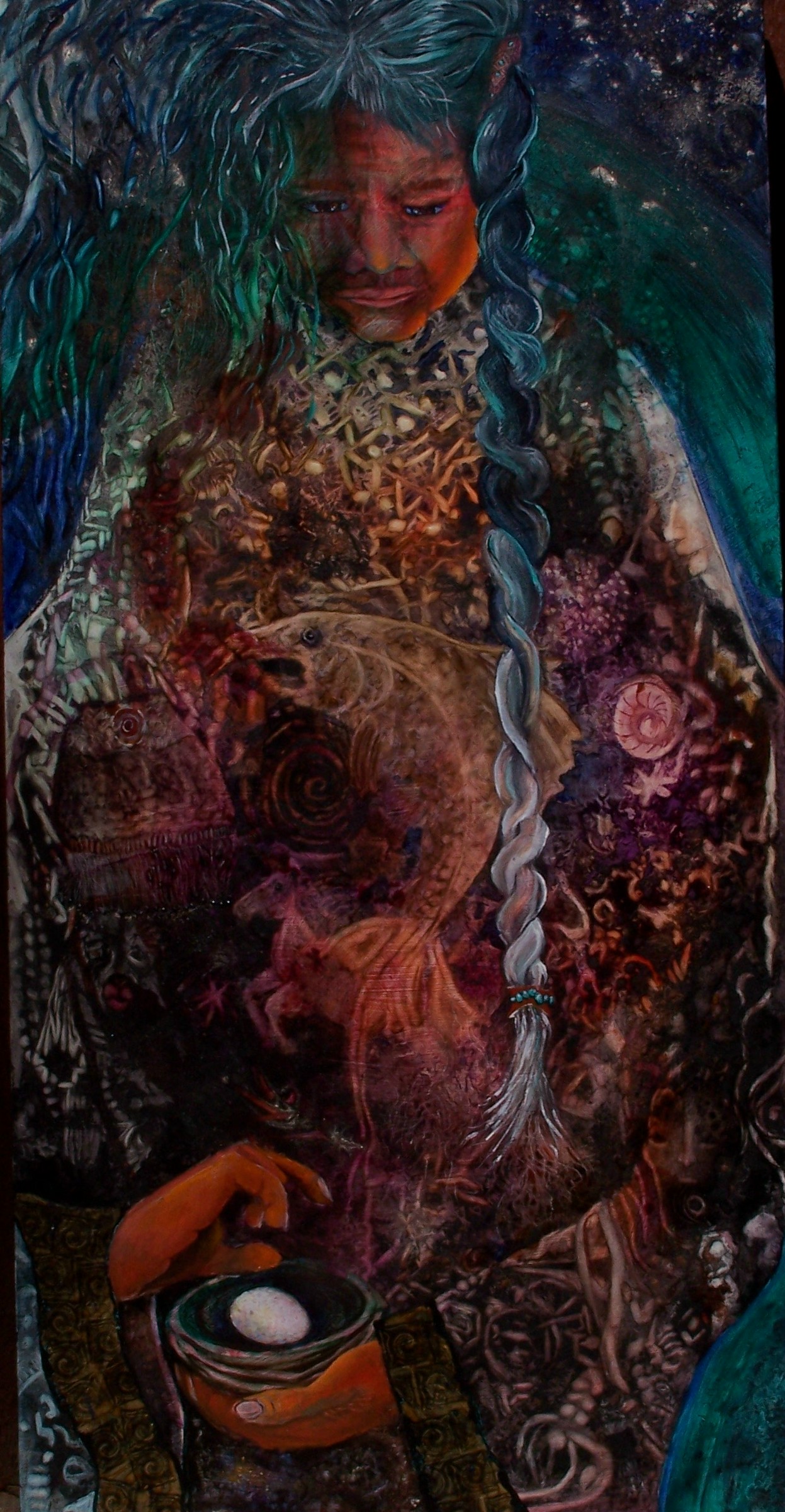 Bone Thrower is painted on an 18″ x 36″ Claybord with a one inch cradle. Framed in a gold “float” frame with maroon “leather” mat behind her, Bone Thrower is riveting. She was juried by Alfredo Arreguin ( www.lindahodgesgallery.com ) into the 2013 Washington State Art Exhibition sponsored by the Collective Visions Gallery in Bremerton.