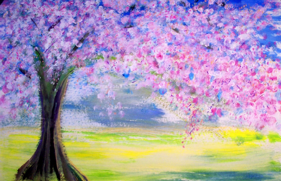From the start, getting on my hands and knees to paint with poster paint on large sheets of paper ( approx 30 x 40 ) was liberating: big movements, really getting into the swing of the whole arm, the sway and stretch of the whole body. I loved it. But the BIG turning point for me was being asked to paint like a kid again. Connie didn’t mean purposely making an image look childish,  like drawing a tree that really looks like a lollipop, but to paint purposely with the confidence of the young child who simply wants to express on paper. Some of us were never lucky enough to experience that freedom of expression as children but I could imagine it from watching my grandchildren draw and paint. So, given that trees are a frequent image for me and that I’d recently been immersed in pink cherry blossoms glowing against a blue sky and feeling overcome with wonder at their pink saturated color glowing in the pink setting sun on a downtown pink glowing pink street – well you get the drift – I had to try and capture the essence of that pink feeling.