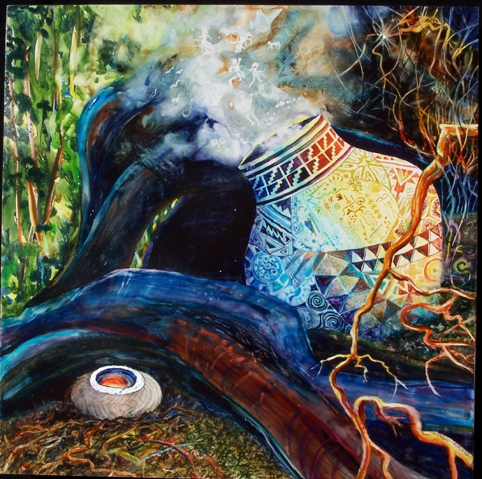 Who’s Dreaming Whom – My first large Claybord watercolor. 24″ x 36″.