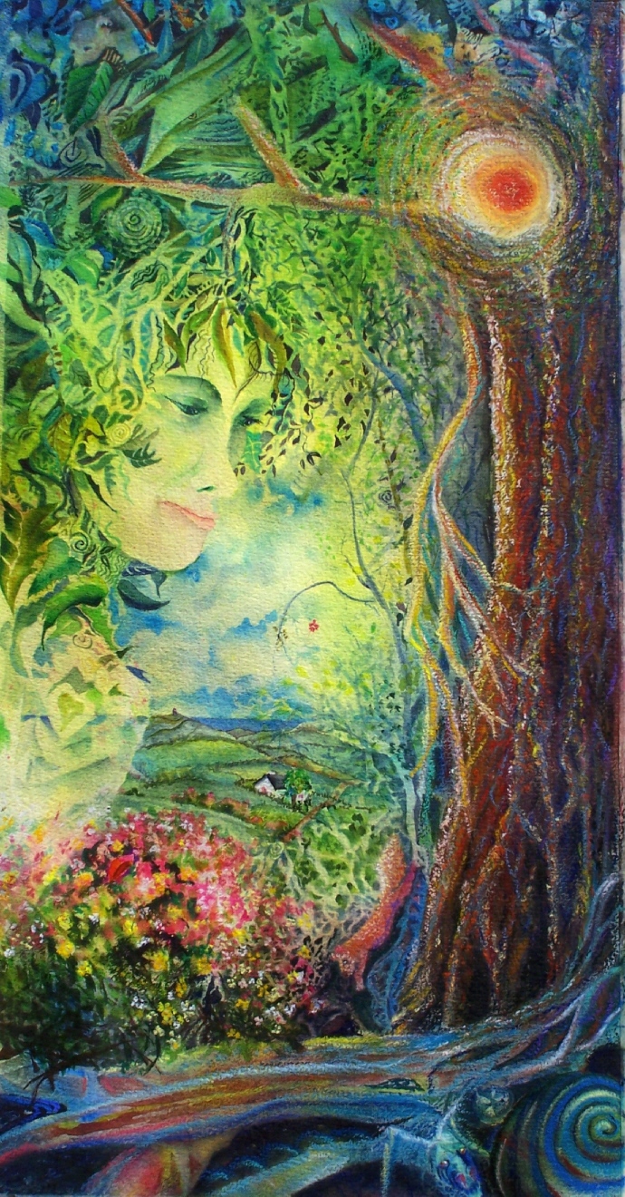 I painted this one rising from the well of wisdom with acorns floating on the surface